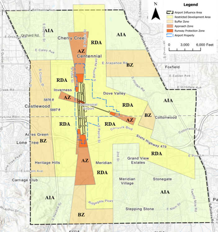 Restricted Development Area (RDA) – Prohibit new residential and other noise sensitive development. Building height must comply with FAR Part 77 surface criteria, existing or future, whichever is more restrictive.
